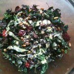Remove large stems from kale leaves and chop, pour lemon juice over, let stand 15 minutes to soften. In small bowl, mix together tahini, olive oil, pressed garlic and salt and pepper. Add pine nuts and dried fruit to bowl, drizzle with dressing and toss.